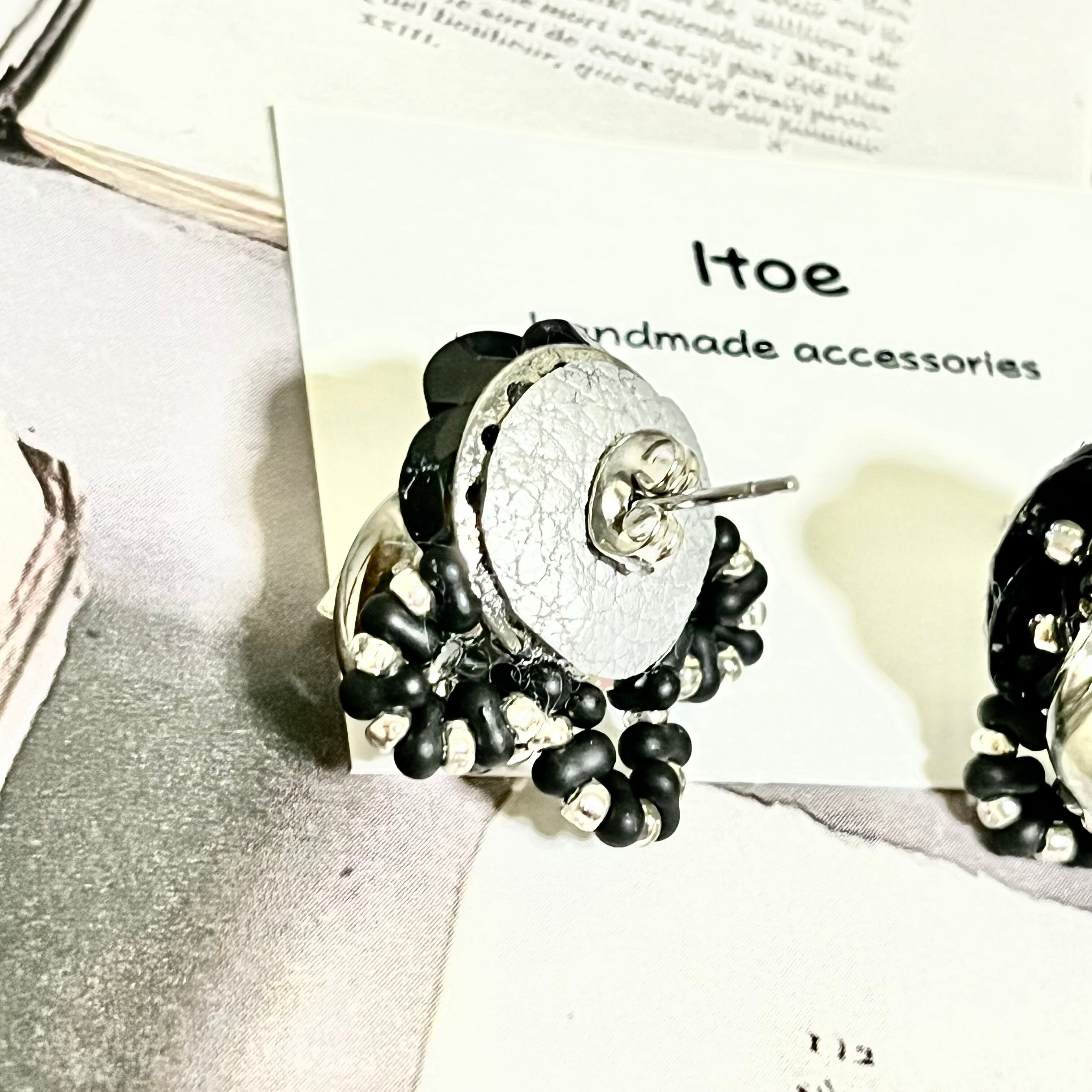 ガラスビーズとファルファーレビーズをシャワー台に編み付けた、大人かっこいいスタッドピアスです(^^)