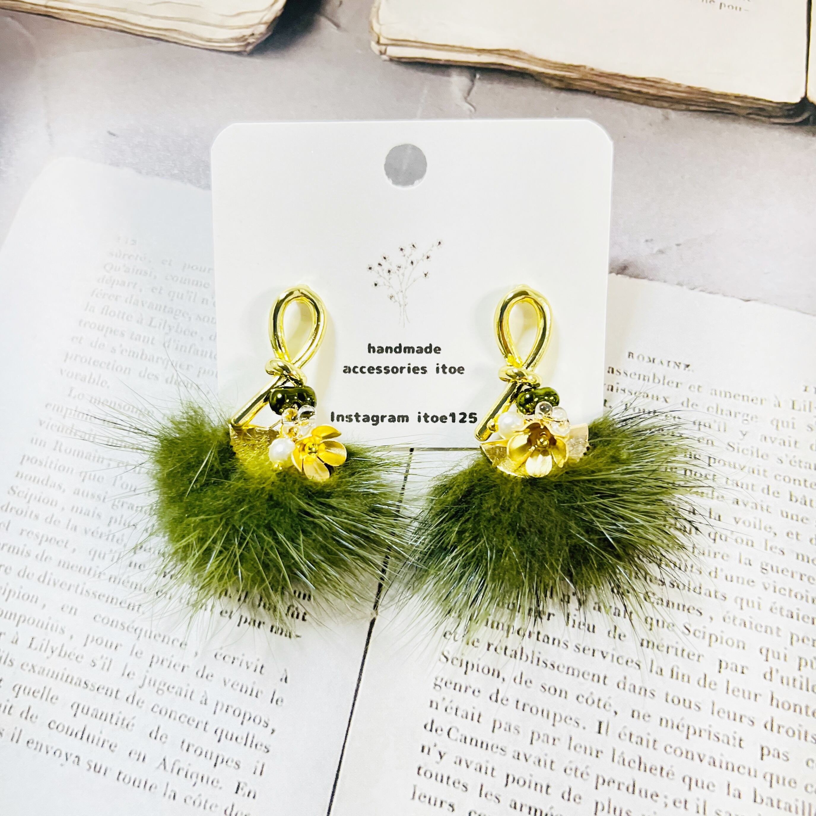 スタッドピアス 結び目 ゴールド系 ファー 緑