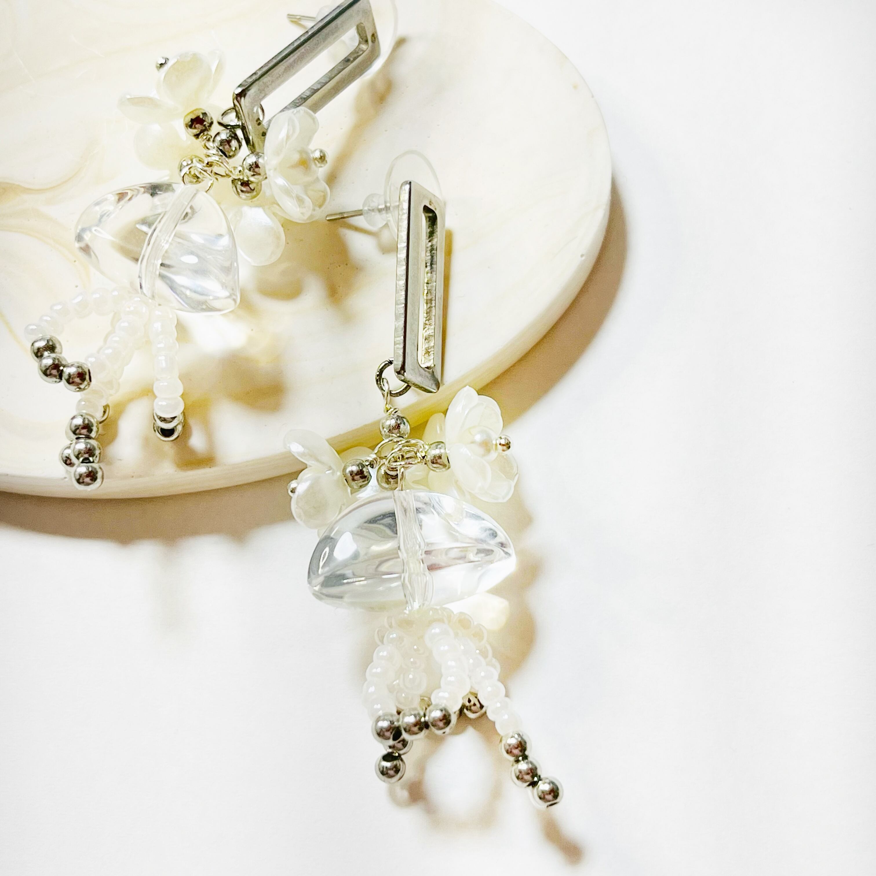 白系スタッドピアス お花 透明ビーズ