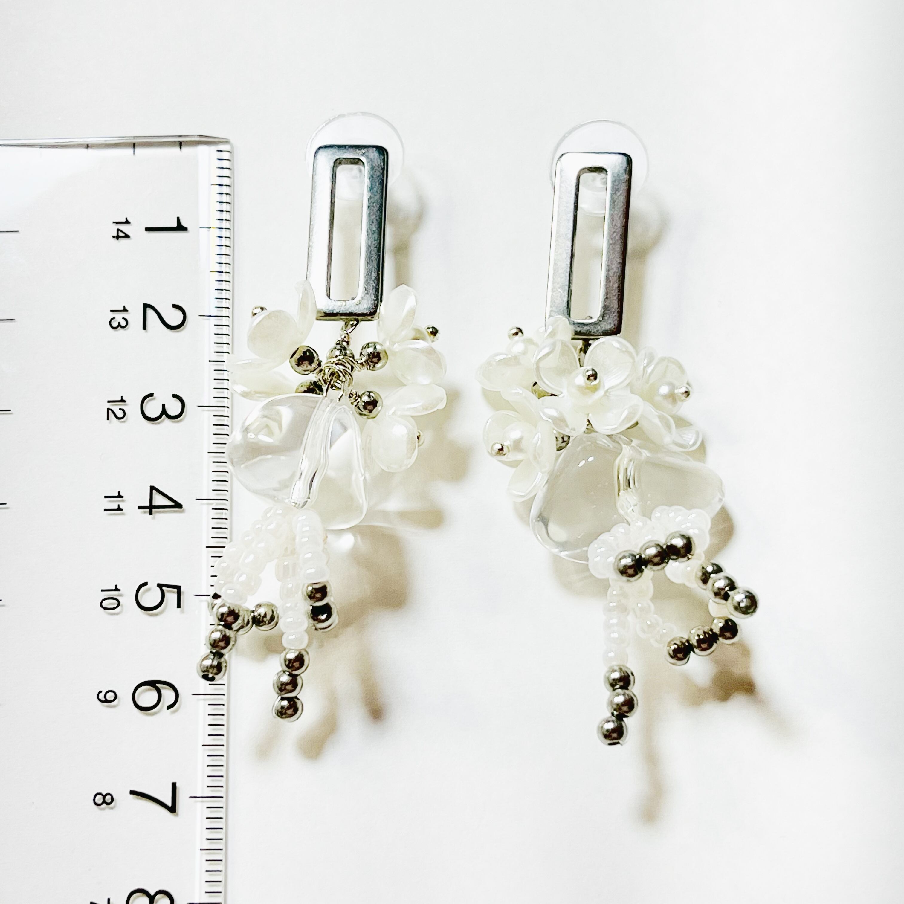 素敵なお花モチーフの白系スタッドピアスです。
